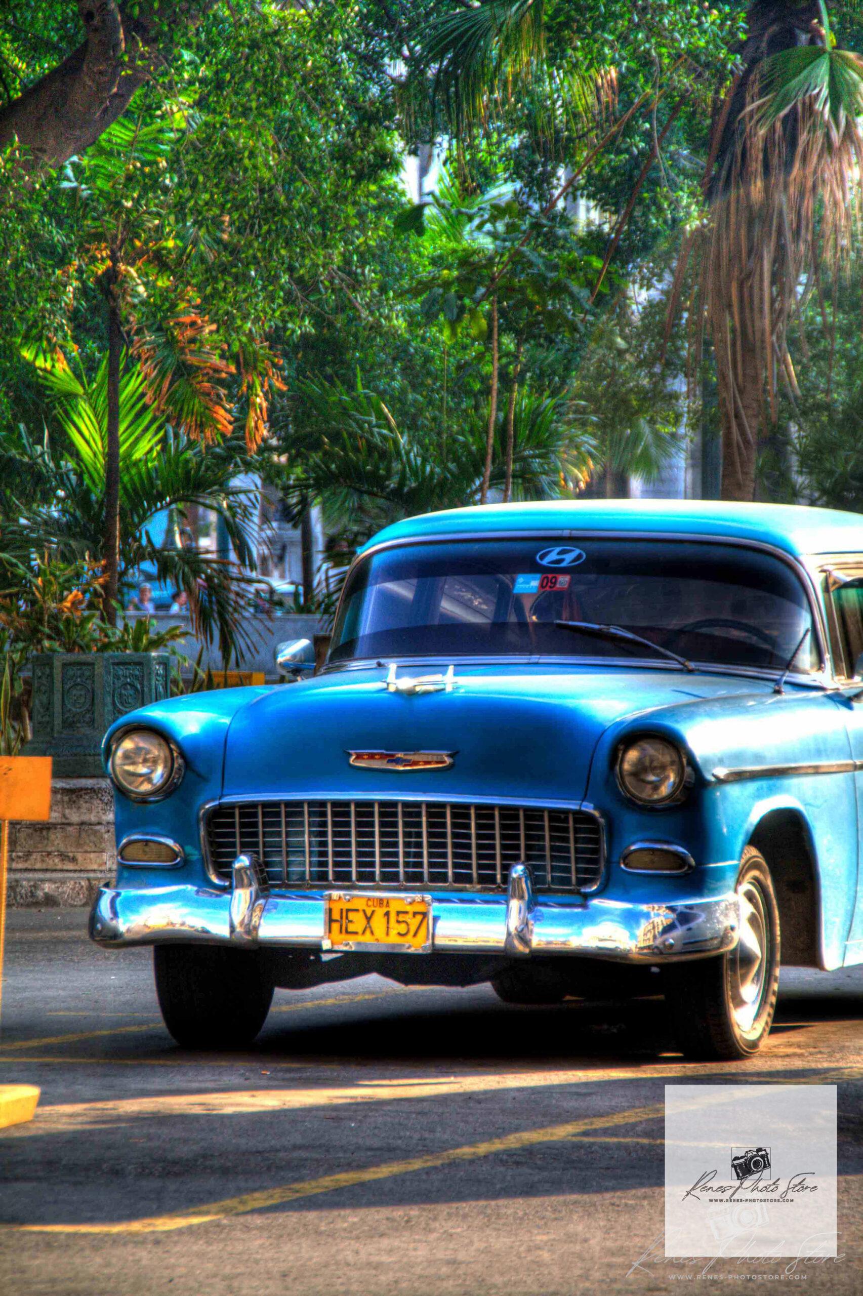 Colorful HDR image of a 1955 Chevrolet Bel Air parked under lush palms in Havana, Cuba. Perfect high‑resolution travel photo download for classic car or Caribbean art lovers.