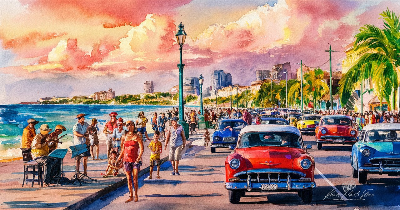 Download a stunning high-resolution AI watercolor image of Havana’s Malecón at sunset, featuring classic cars, musicians, and bustling Cuban street life. Ideal for lovers of travel and vibrant decor.