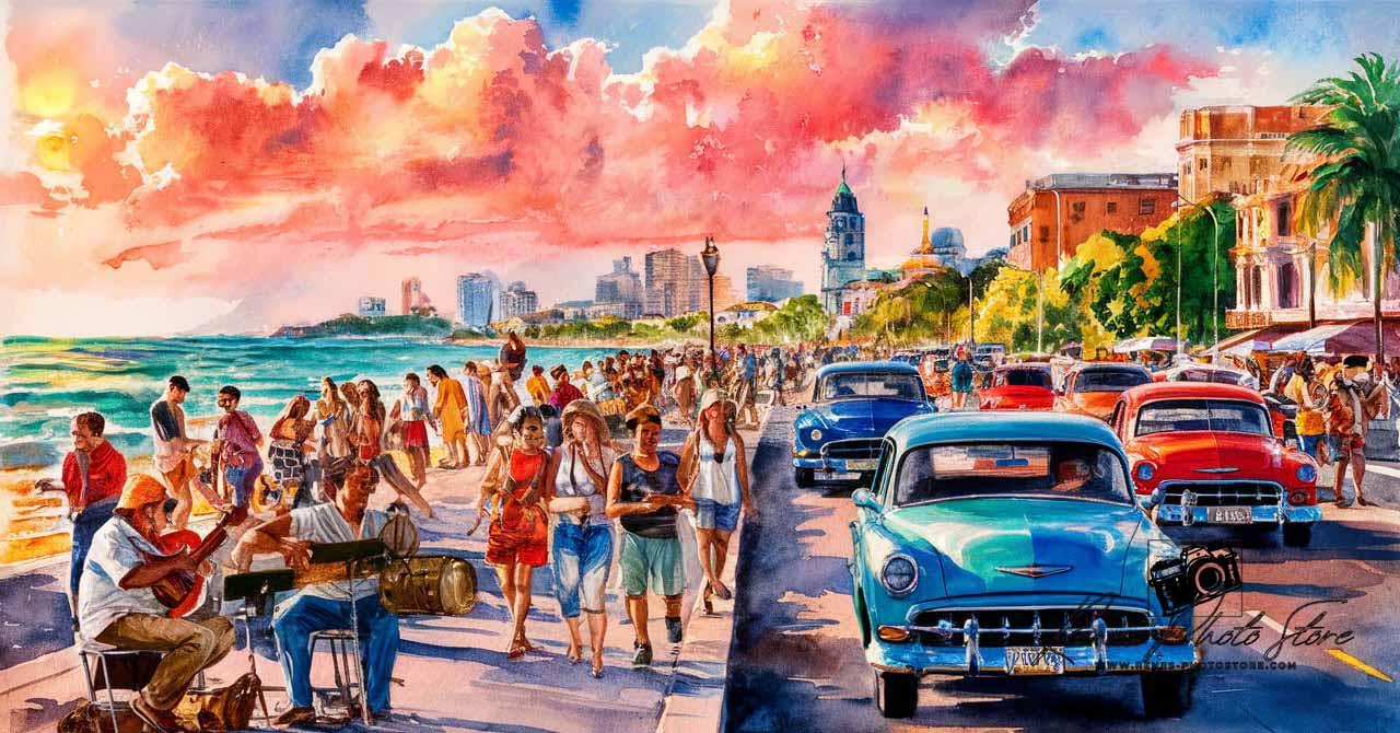 Download a high-resolution AI watercolor image of Havana’s Malecón in the morning, with classic cars, street musicians, and vibrant Cuban life. Ideal for travel art lovers and bright décor.