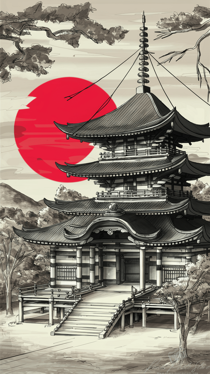 Download this stunning high-resolution AI artwork depicting a traditional Japanese pagoda in Kyoto, set against the dramatic backdrop of a bold crimson sun. The hand-drawn, sumi-e-inspired lines and subtle sepia tones lend a timeless elegance, while the iconic temple architecture is rendered in exquisite detail. Twisting pine branches frame the ancient structure, evoking the serene beauty of Japan’s sacred heritage. The image captures a tranquil, contemplative mood—ideal for collectors, travel enthusiasts, and modern interiors seeking a touch of classic Asian ambiance. Delivered as a premium digital download for display or creative projects.