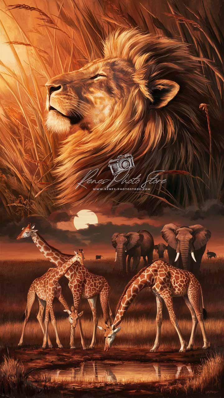Bring the majesty of the savannah into your space with this premium high-resolution AI digital artwork, featuring a powerful lion basking in golden grasses above a tranquil herd of giraffes and elephants at dusk. Warm sunset hues illuminate every texture, from the lion’s regal mane to the reflections at the waterhole, while sweeping grasslands and distant acacia silhouettes evoke the timeless beauty of Africa’s wild heart. Perfect for wildlife lovers and striking modern decor, this digital download offers exquisite detail—ideal for fine art display or creative projects.