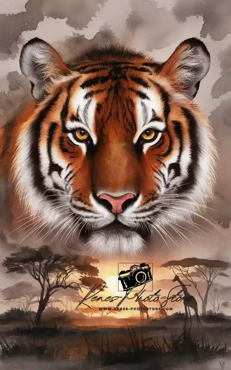 Bring the wild into your space with this striking AI-generated digital tiger artwork. A powerful tiger stares directly at the viewer, its warm amber eyes contrasted against bold black and white stripes, floating above a golden African savanna at sunset. The soft watercolor texture and dramatic lighting create a cinematic, dreamlike mood perfect for modern interiors, travel blogs, or wildlife-themed projects. This high‑resolution digital download is ideal for wall art prints, posters, web use, and social media branding. No physical print will be shipped—simply download, print, and enjoy this unique piece of digital photo art instantly.