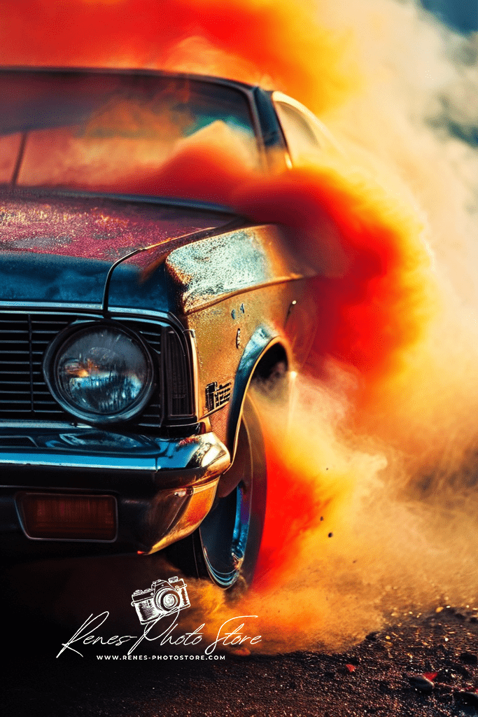 Dramatic digital photo of a classic muscle car burnout with fiery orange smoke. Perfect high-res download for posters, covers, and automotive art.