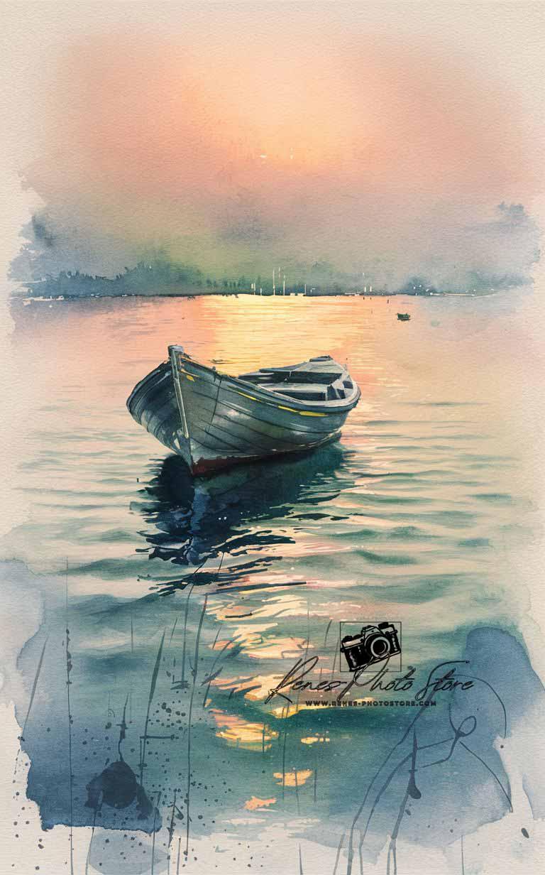 Download a high-resolution AI watercolor photo of a rowboat at sunset on a tranquil lake. Ideal for peaceful wall art, relaxing décor, or nature-inspired interiors.