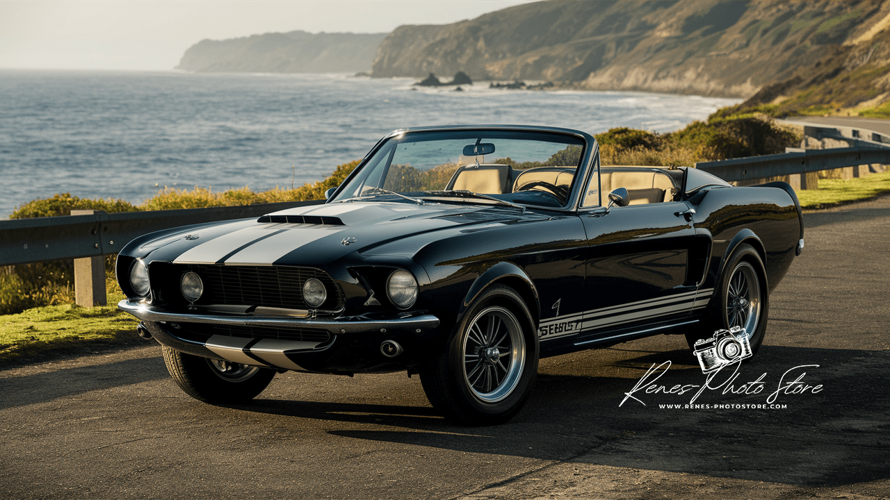 Embody the spirit of American muscle with this premium high-resolution AI artwork featuring a legendary black Shelby GT500 convertible parked majestically along California’s Pacific Coast. Sunlight sparkles over its gleaming chrome and iconic racing stripes, while ocean waves and dramatic cliffs create the ultimate backdrop for a road trip dream. Perfect for collectors, automotive enthusiasts, or anyone seeking vintage luxury décor, this digital download captures every detail of classic style—ideal for display or creative use.