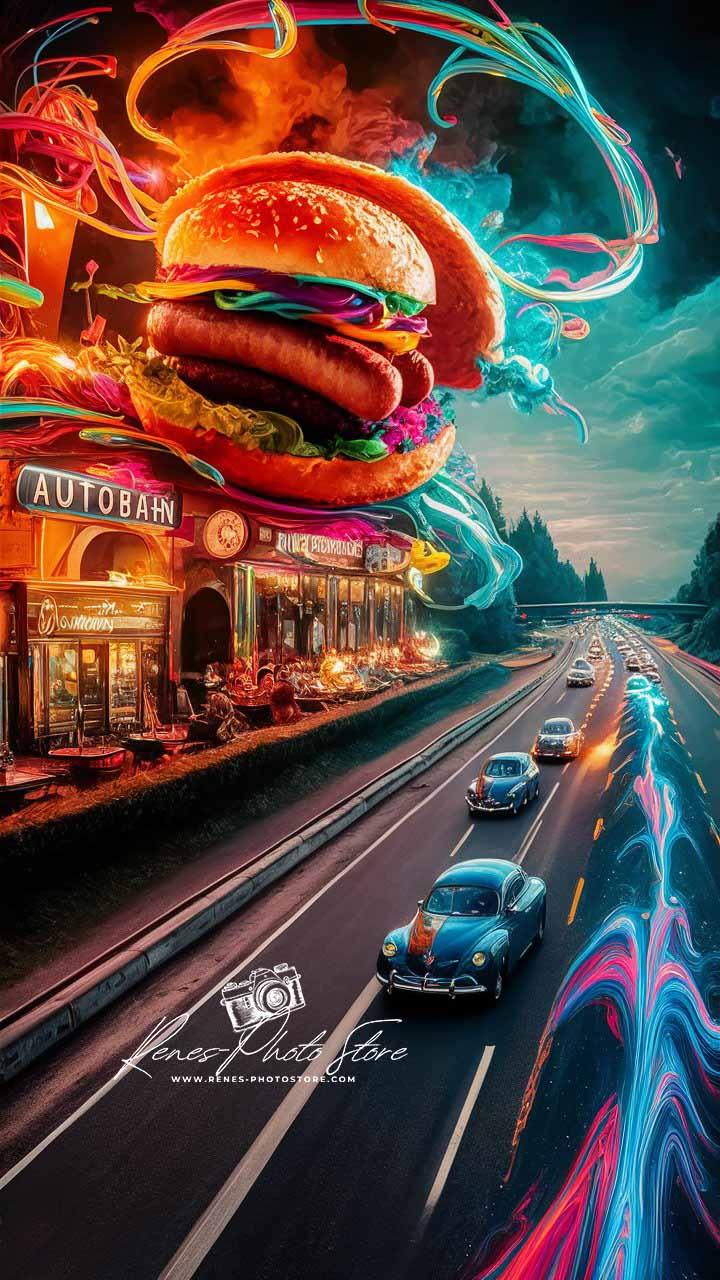 Surreal Autobahn Burger Highway | Neon Retro Diner Art Photo Download